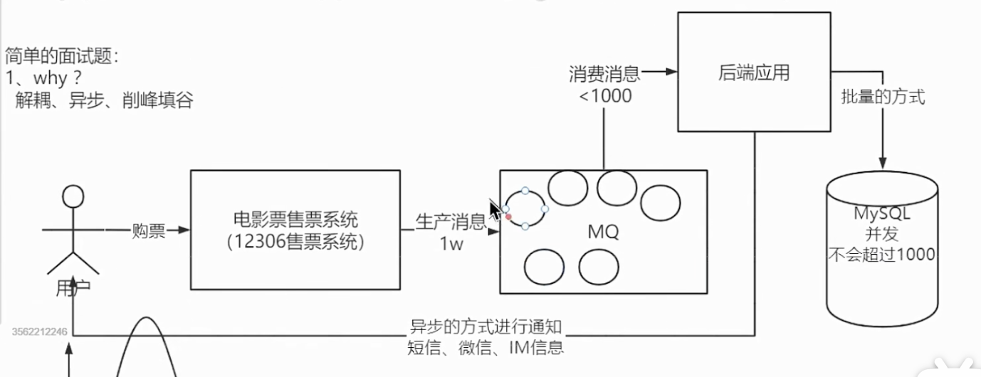 用我自己的话解释下这几个名词:购票和写入数据库的操作具有强耦合性,加入中间件后,实现了这两步操作的解耦(用户的购票消息先生成生产消息加入消息队列,然后交给后端应用进行消费,再由后端应用批量写入数据库)