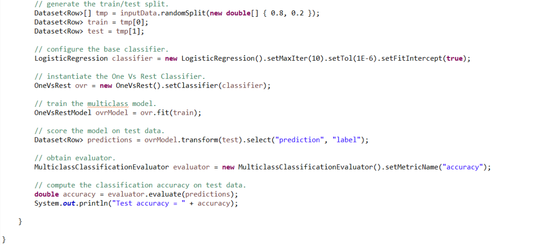 One-vs-Rest 分类器(也称为 One-vs-All)是一种将二分类算法扩展到多分类任务的常用策略,其核心思想是为每个类别训练一个二分类模型,例如,假设有 n 个类别,One-vs-Rest 会训练 n个二分类器,每个分类器专注于判断样本是否属于某一特定类别。在预测阶段,系统会运行所有分类器,并选择输出得分最高或概率最大的那个分类器所对应的类别作为最终预测结果。