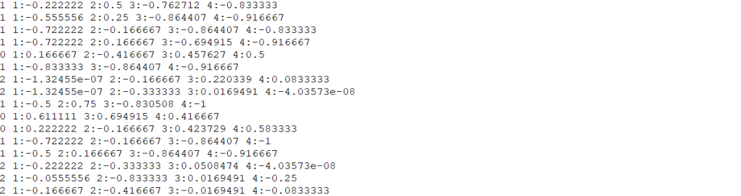 数据分类sample_multiclass_classification_data的标准测试数据集合的部分数据样本,其中,第一列是标签,用于标识数据的分类(多分类),其他列是特征数据(特征值对应的索引号:特征值):