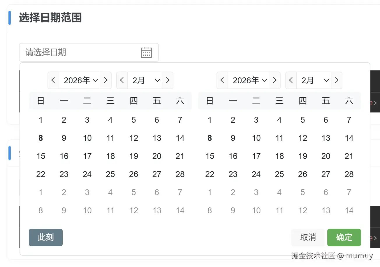 | range | [['2026-01-01','2026-06-30']] | 限制选择范围 [['2026-01-01','2026-06-30']] - 限制日期 [['09:00','21:00']] - 限制时间 [['2026-01-01',null]] - 单向限制 |