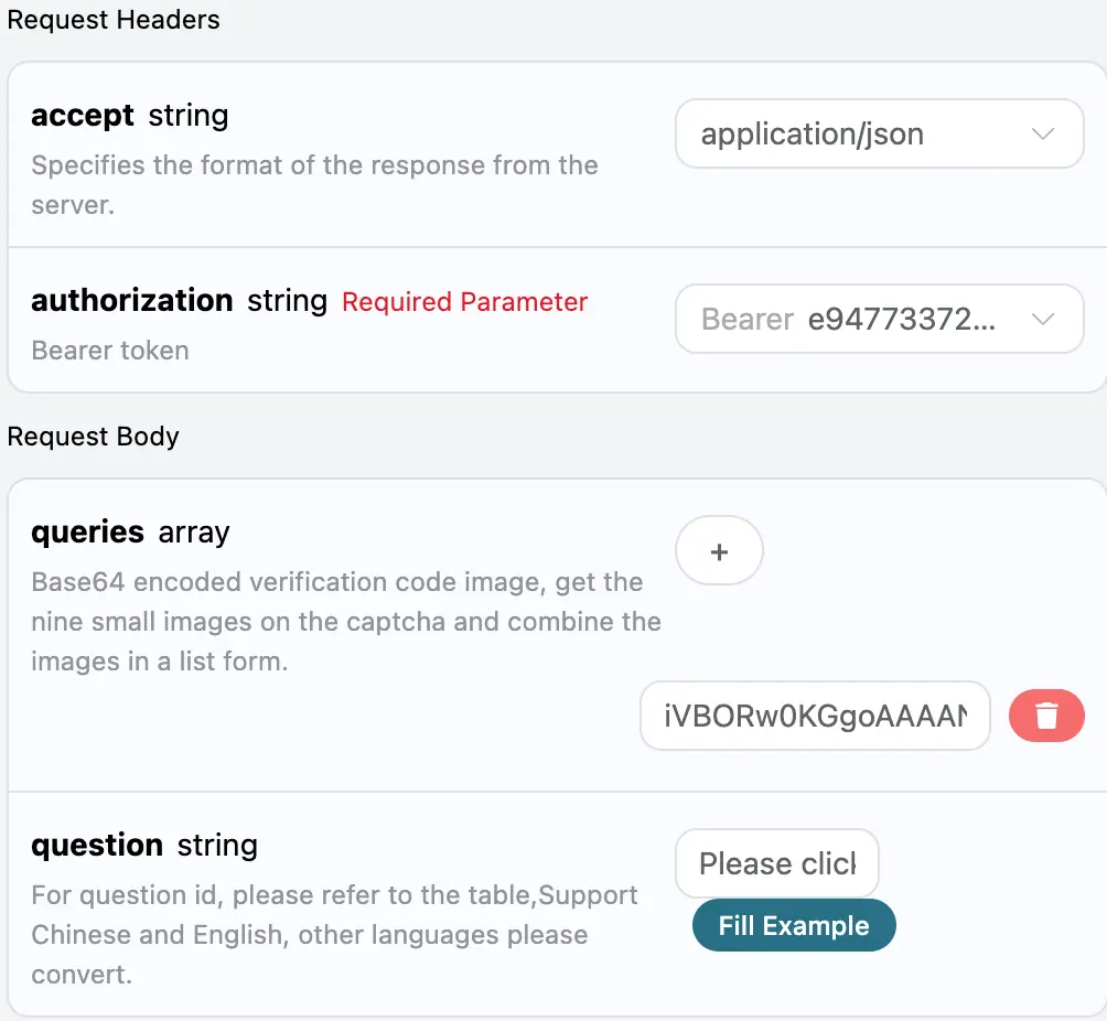 queries:Base64编码的验证码图像列表。question:验证码图像相关的识别内容参数,支持直接输入中英文。