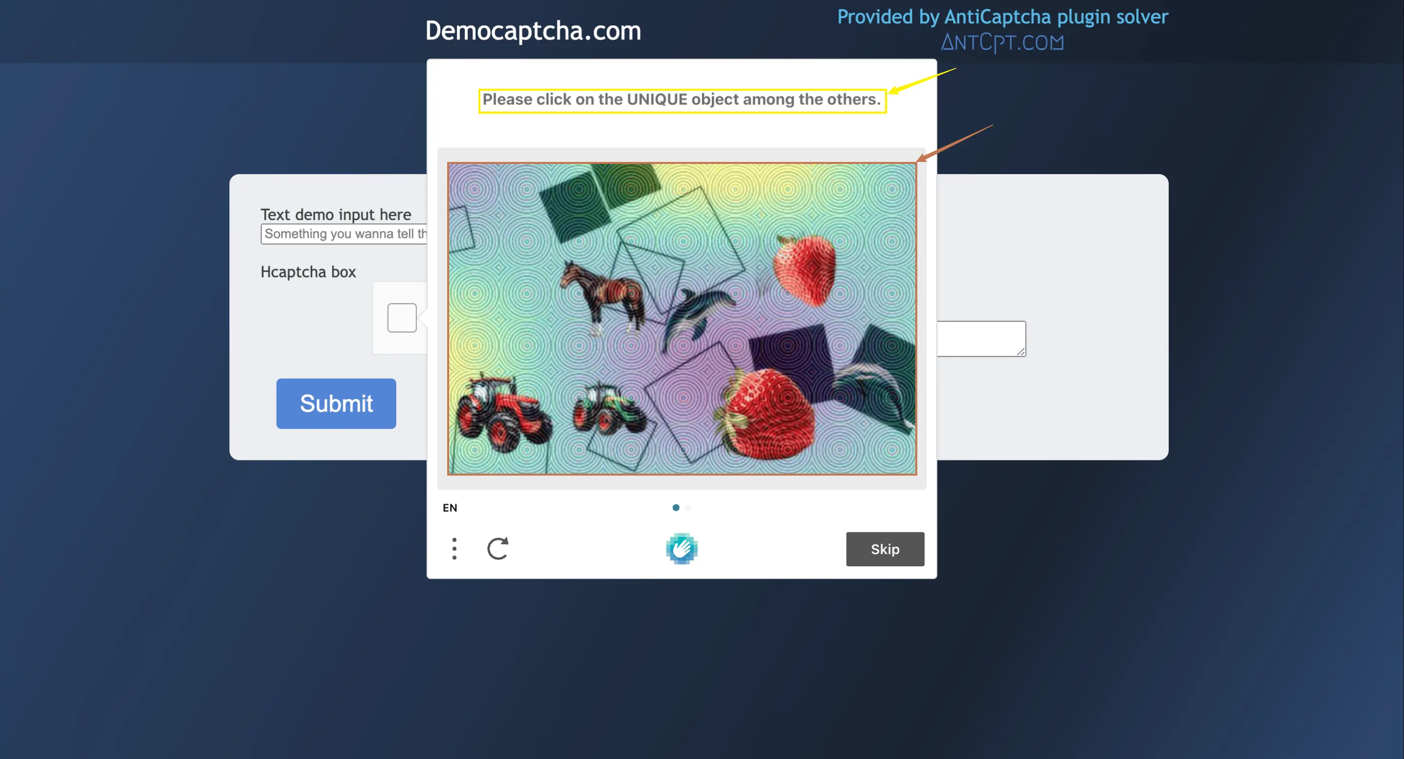首先先了解下基本的使用方式,就是输入需要处理 hCaptcha验证码图像,便可获得处理后的结果,首先需要简单地传递一个 queries 字段,这个就是具体hCaptcha验证码图像,我们需要去一个有hCaptcha验证码网站中截取这个验证码图片,示例网站链接为: https://democaptcha.com/demo-form-eng/hcaptcha.html,点击复选框即可显示具体的完整验证码图片,如下图所示: