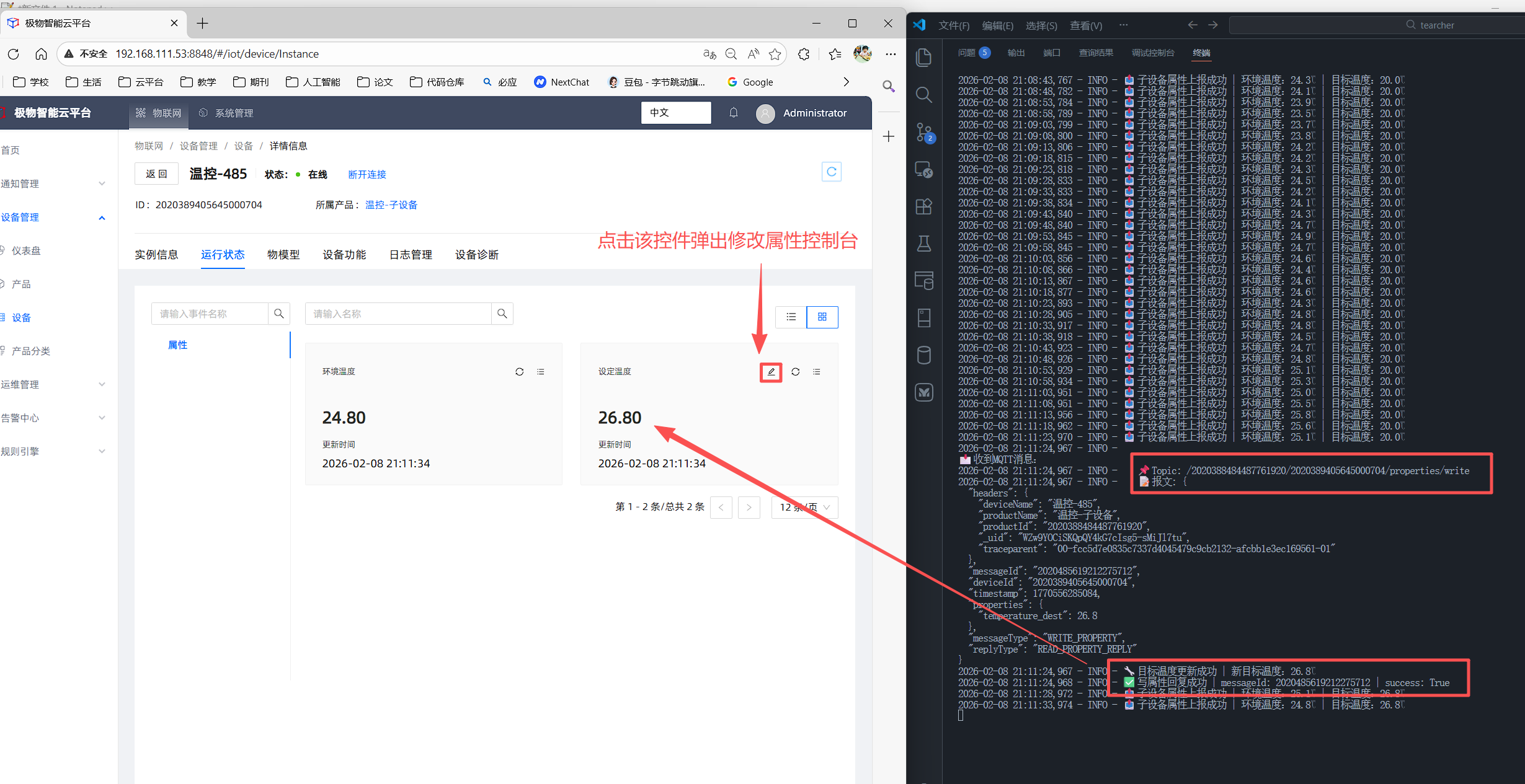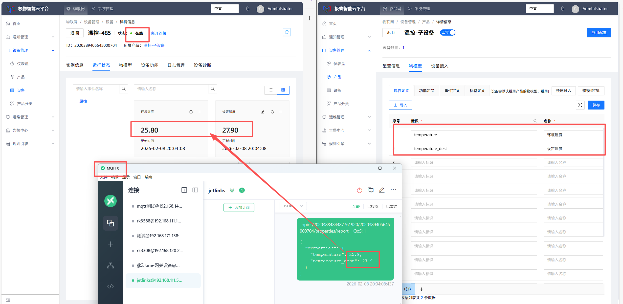 云平台下发目标温度修改指令后,网关接收并处理,上报的属性值与Web端显示一致: