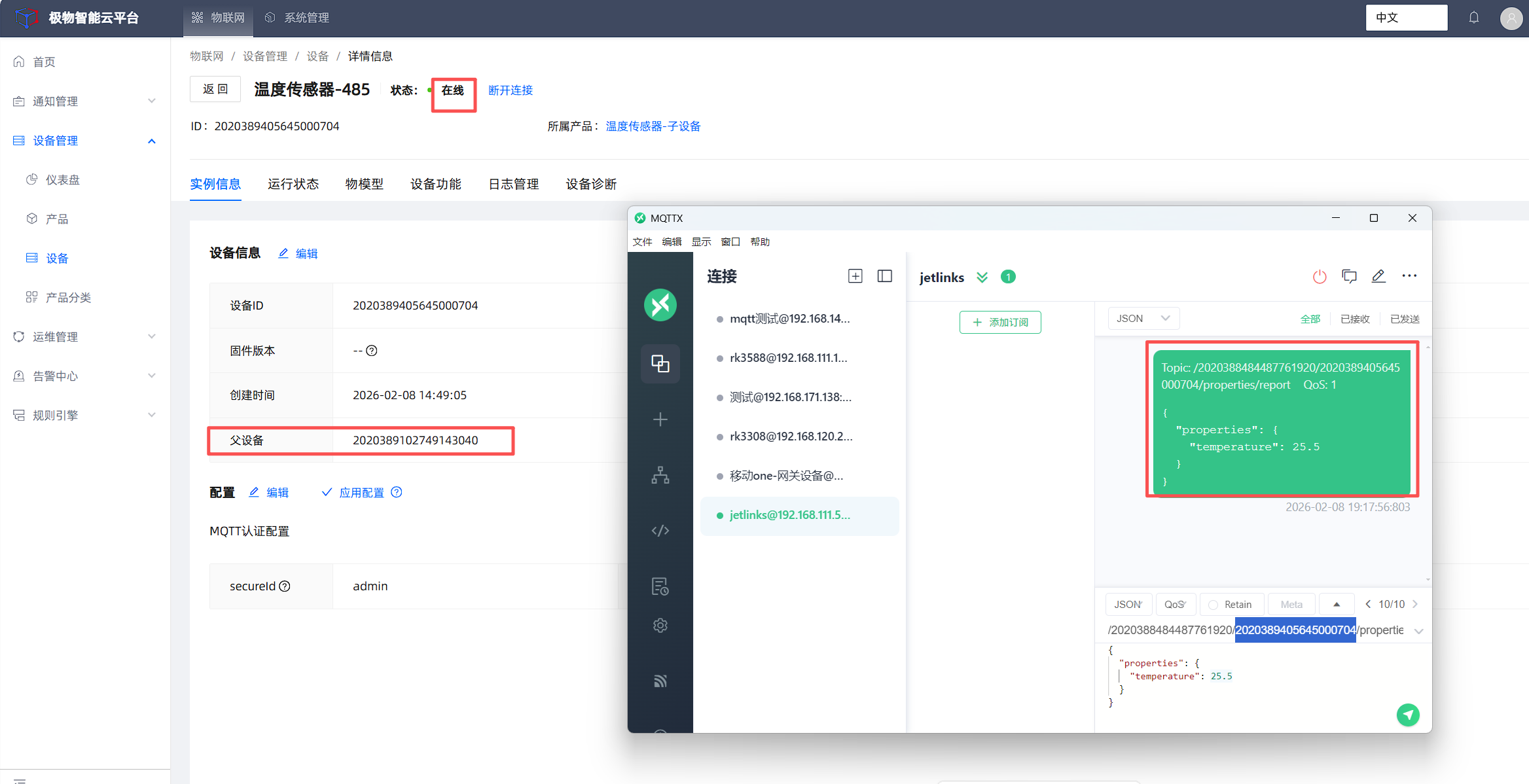 - 子设备上线核心:子设备无独立MQTT连接,需通过网关上报任意属性触发上线;