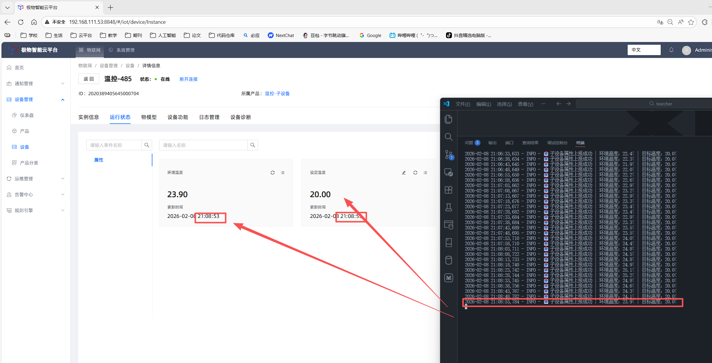 运行代码后,日志中可看到每5秒上报的温度属性,与云平台显示的时间、数值完全一致: