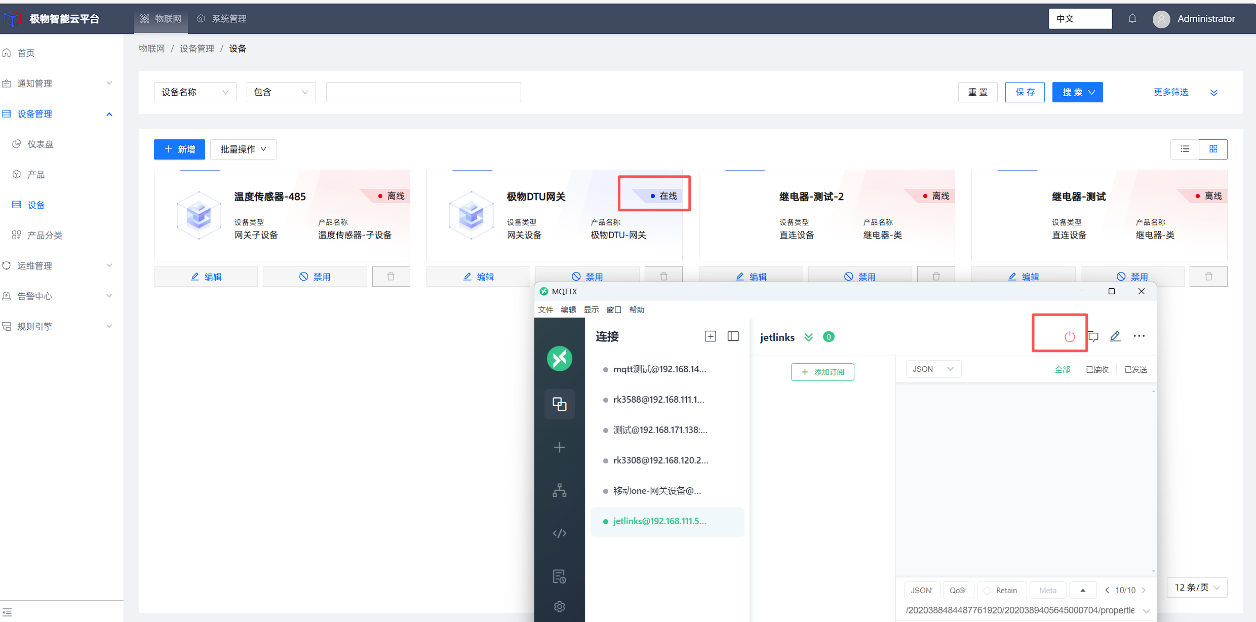 通过网关的MQTT通道发送任意属性上报报文,子设备立即上线: