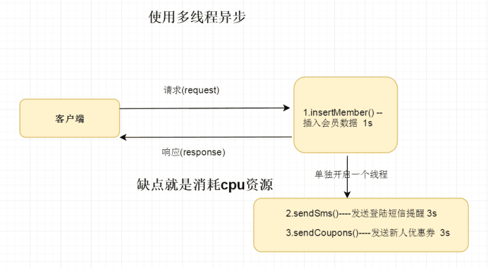 用户向数据库中插入一条数据之后,在单独开启一个线程异步发送短信和优惠操作。