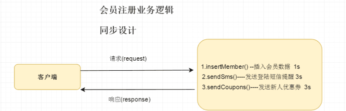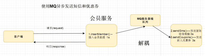 先向数据库中插入一条会员数据,然后再向MQ中投递一个消息,MQ服务器端在将消息推送给消费者异步解耦处理发送短信和优惠券。