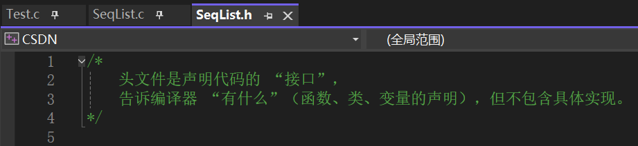 需创建 3 个文件,分工明确,便于维护和调试,后续学链表、栈等结构也可复用此结构。头文件为 SeqList.h,实现文件为 SeqList.c,测试文件为 test.c。