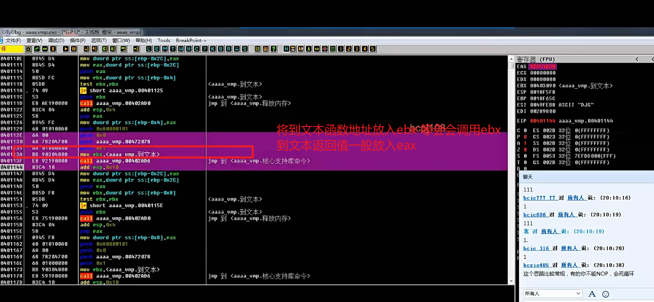 将到文本函数地址放入ebx 等会会调用ebx 到文本返回值一般放入eax