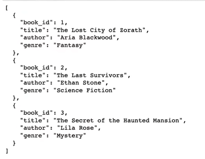 生成三本虚构书籍的清单,包括书名、作者和类型。请用 JSON