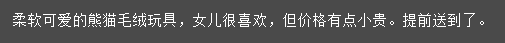 给我女儿的生日买了这个熊猫毛绒玩具,她非常喜欢,随身带着到处去。它很软,非常可爱,脸上有友好的表情。不过对于我支付的价格来说,它有点小。我觉得可能有其他同样价格但更大的选择。它比预期提前一天到达,所以我在送给她之前自己先玩了一会儿。
