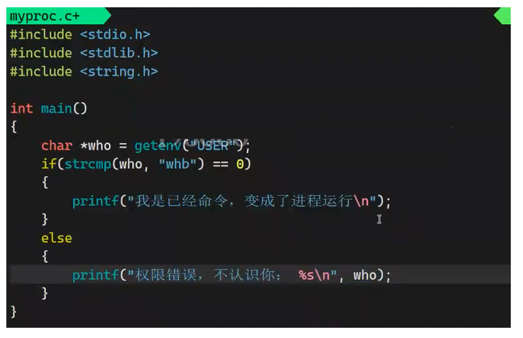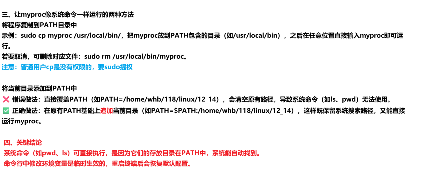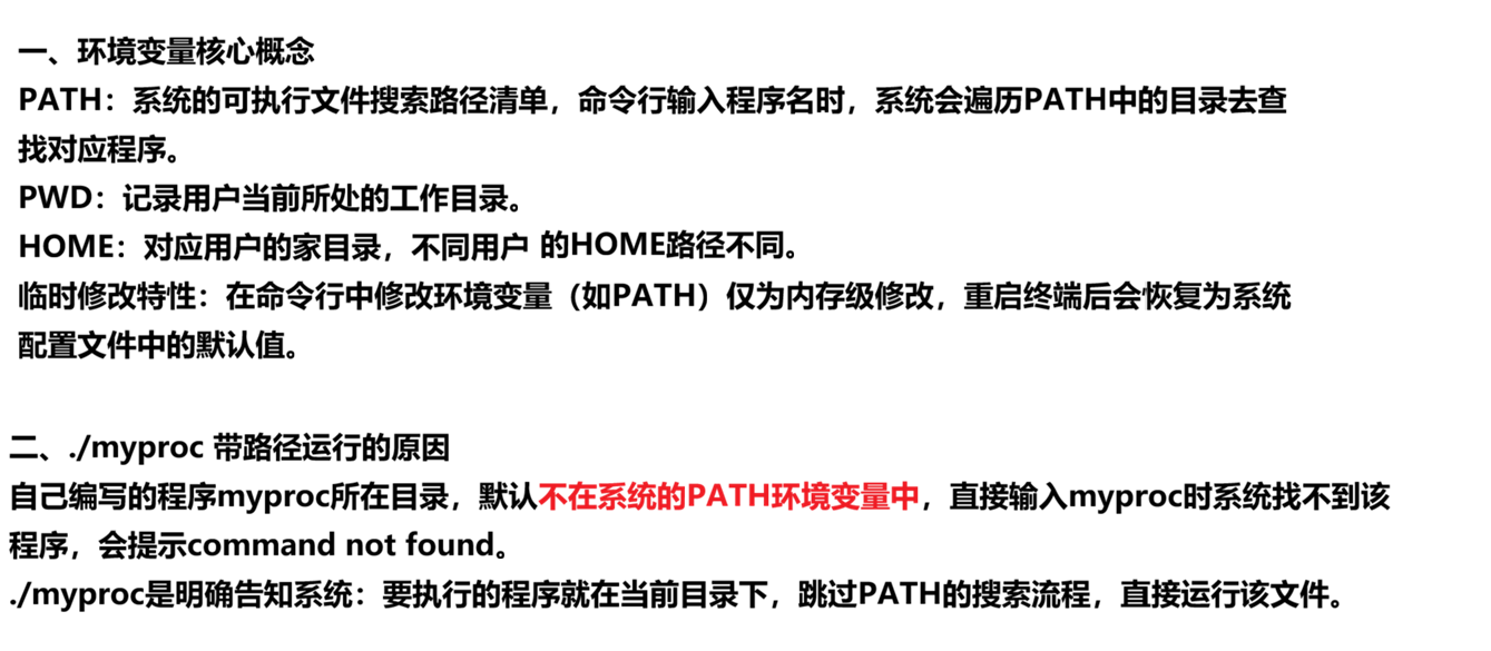 ./myproc:你的程序所在的当前目录不在 PATH 中,所以必须用 ./ 明确告诉系统程序的位置,强制它直接执行当前目录下的文件