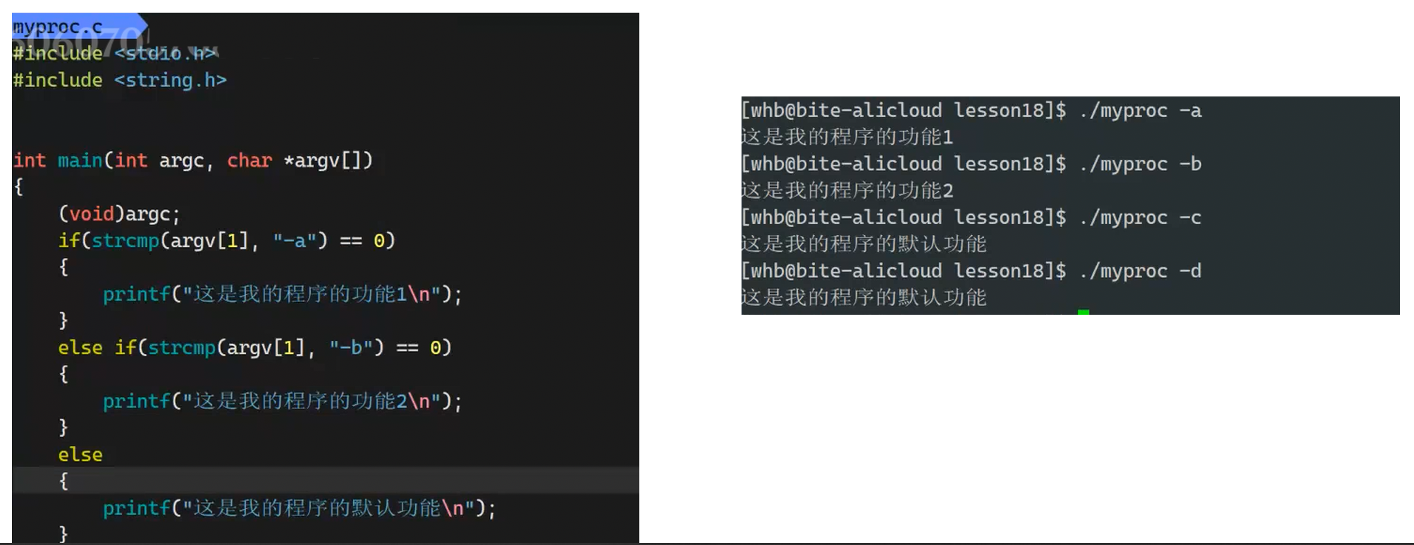 通过上面的两个参数我们发现:bash是以空格为分隔符,把每个字符填入到argv中,argv表以NULL结尾,让函数实现多选项功能