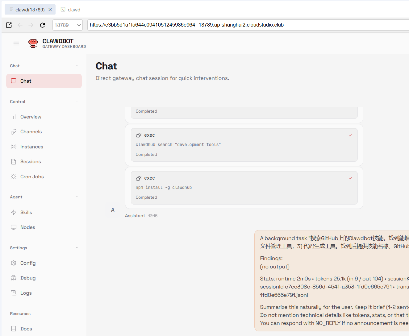 这个方案完美结合了CloudStudio的灵活计算资源 和飞书极致便捷的沟通体验,是一个非常优雅的解决方案。恭喜您走到了这一步!