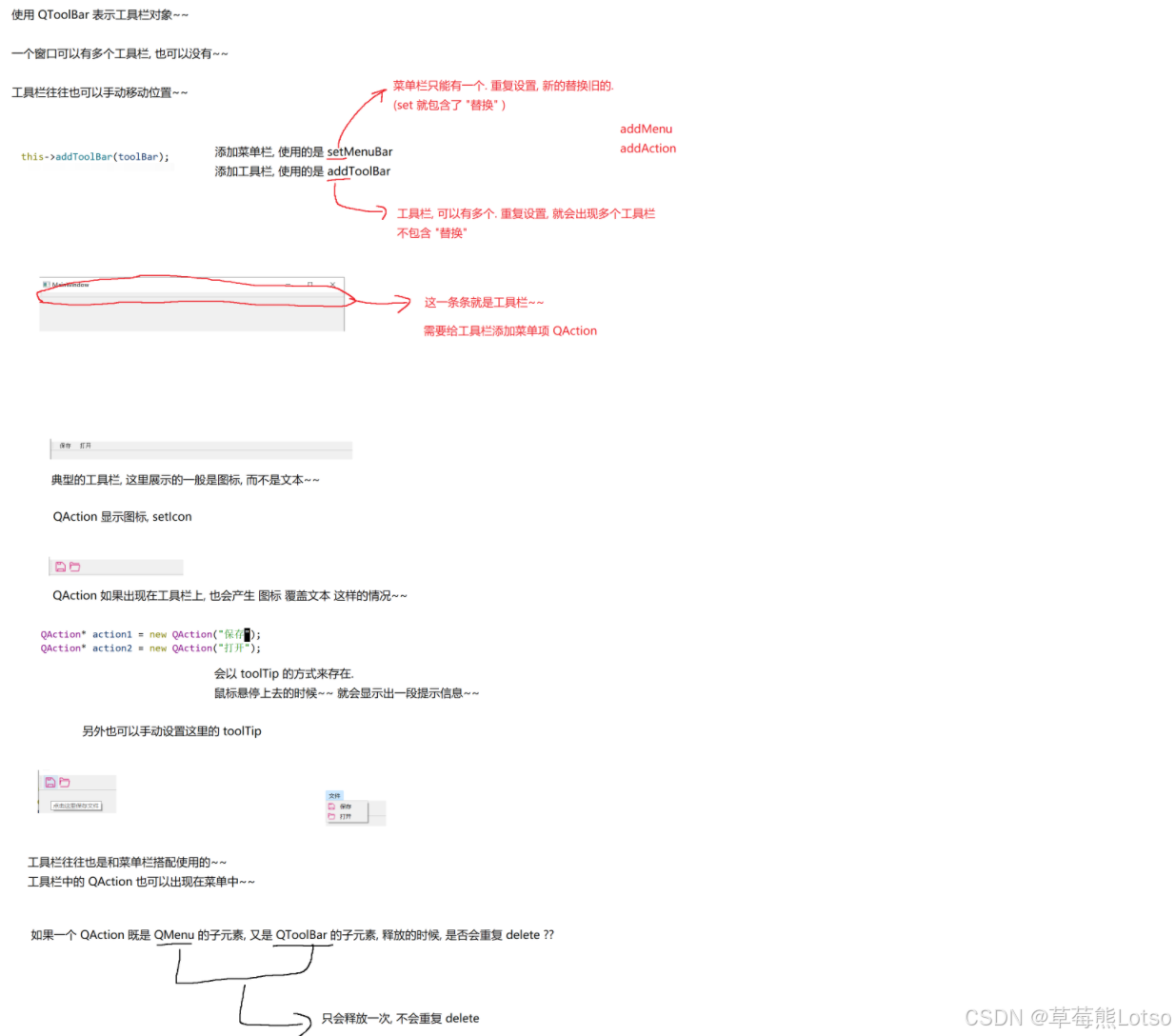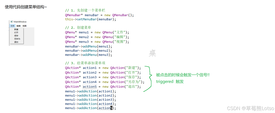 new QAction("菜单项名称", this),通过menu->addAction(action)添加到菜单; - 关键功能 :