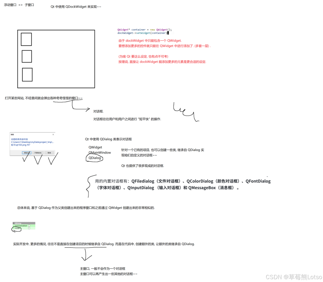 核心属性 :setFloating(false):是否默认浮动(默认 true,false 为停靠状态);setWidget(widget):设置浮动窗口的内部控件(如列表、文本框);setFeatures(QDockWidget::DockWidgetMovable | QDockWidget::DockWidgetClosable):设置支持的功能(移动、关闭、浮动);