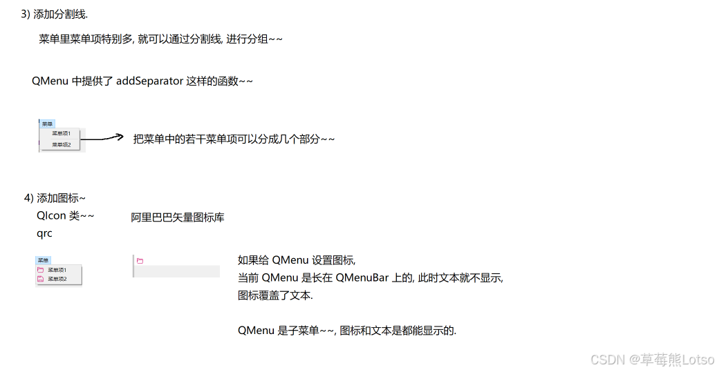 new QMenu("菜单名称", this),通过menubar->addMenu(menu)添加到菜单栏; - 菜单项创建 :