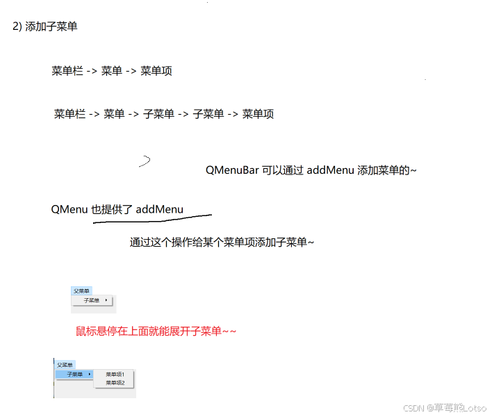 menuBar()(QMainWindow 内置方法,直接获取菜单栏对象)或new QMenuBar(this)(动态创建); - 菜单创建 :