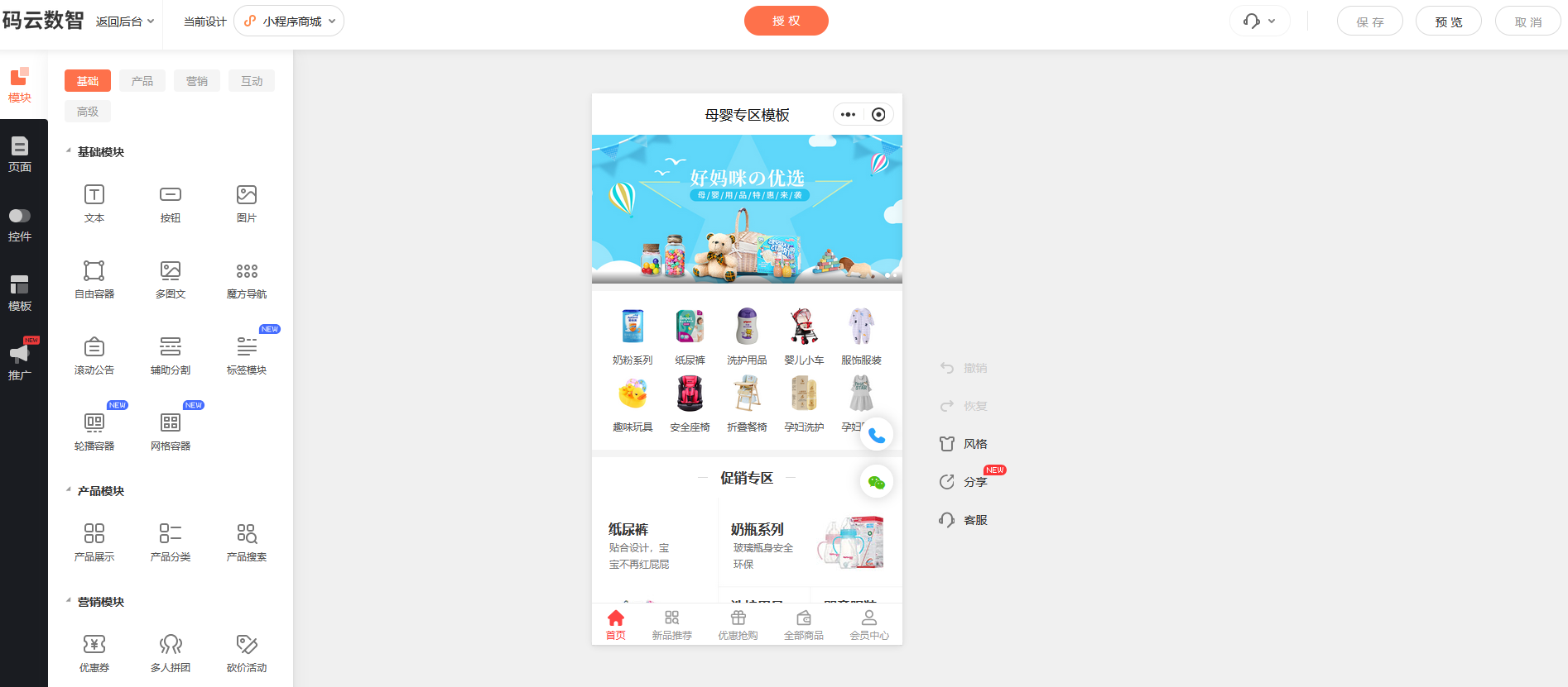 • 优势:无需技术背景,通过拖拽式编辑最快30分钟即可上线商城,是快速验证商业模式、试水线上业务的理想选择。