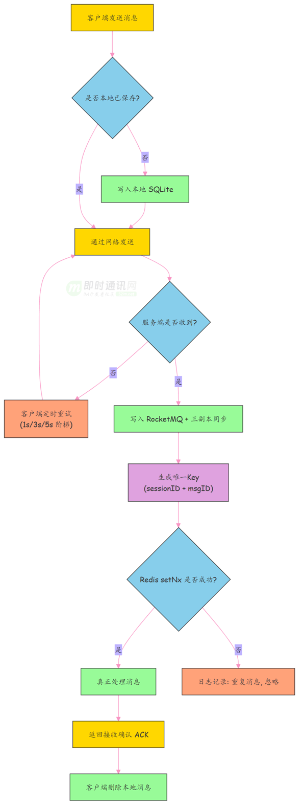- 客户端生成唯一 ID → 本地落库 → 发送