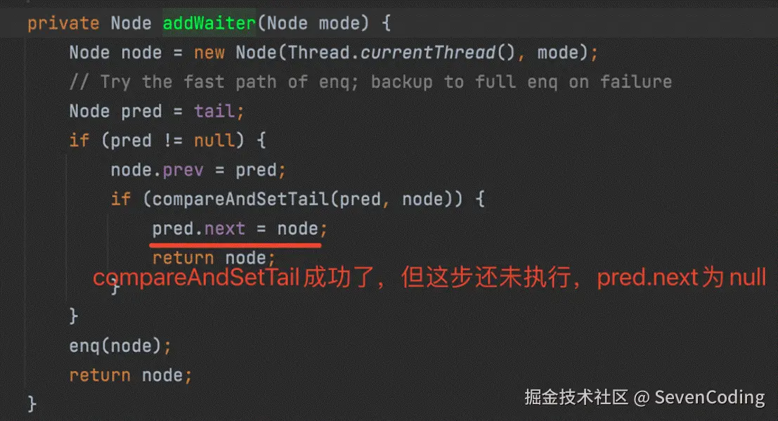 2. addWaiter()将该线程加入等待队列的尾部,并标记为独占模式;