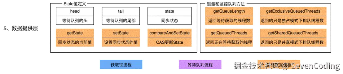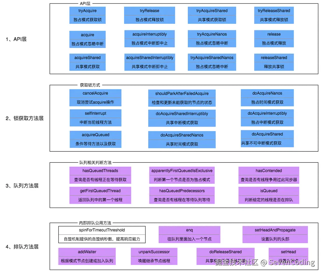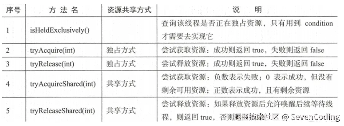 AQS只是一个框架 ,只定义了一个接口,具体资源的获取、释放都由自定义同步器去实现。不同的自定义同步器争用共享资源的方式也不同,自定义同步器在实现时只需实现共享资源state的获取与释放方式即可,至于具体线程等待队列的维护,如获取资源失败入队、唤醒出队等, AQS 已经在顶层实现好(就是模板方法模式),不需要具体的同步器再做处理。自定义同步器实现时主要实现以下几种方法: