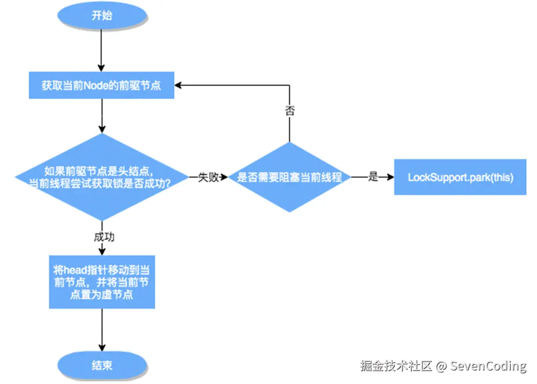 3. acquireQueued()使线程阻塞在等待队列中获取资源,一直获取到资源后才返回。如果在整个等待过程中被中断过,则返回true,否则返回false。