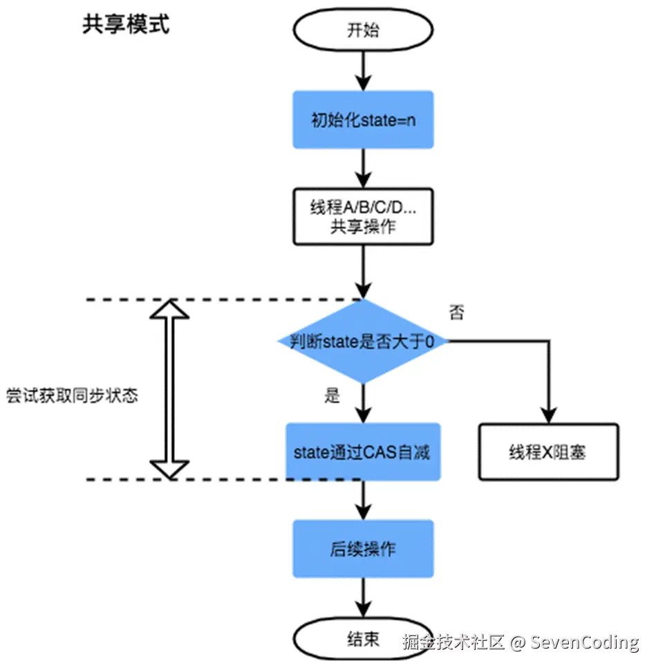 • 共享式:多个线程可同时执行,具体的 Java 实现有 Semaphore和CountDownLatch。