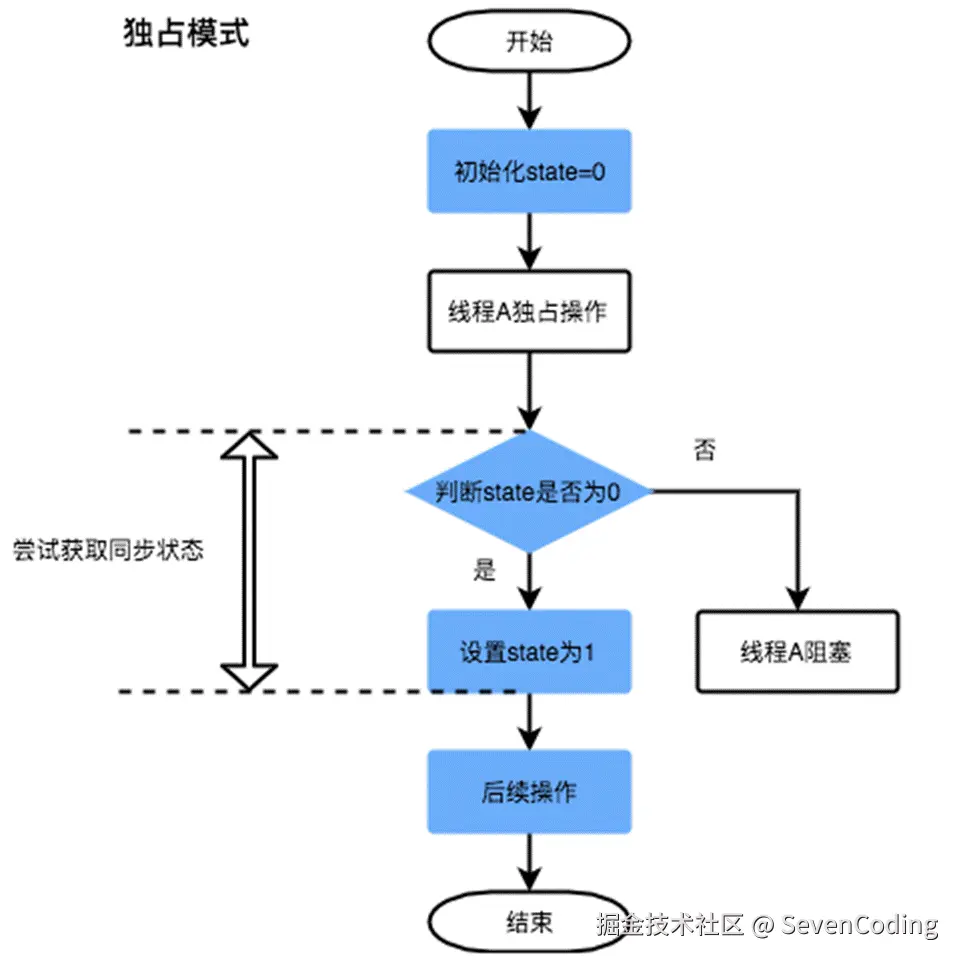 除了Mutex,ReentrantLock/CountDownLatch/Semphore这些同步类的实现方式都差不多,不同的地方就在获取-释放资源的方式tryAcquire-tryRelelase。