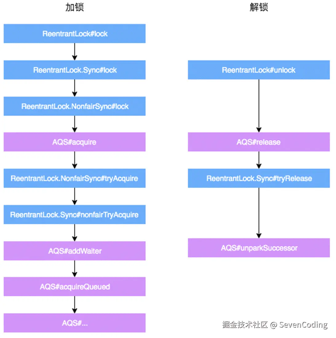 以ReentrantLock的非公平锁为例,将加锁和解锁的交互流程单独拎出来强调一下