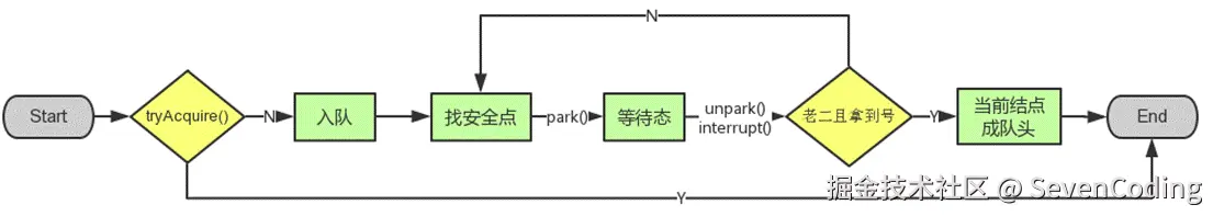 AQS 为每个共享资源都设置一个共享资源锁,线程在需要访问共享资源时首先需要获取共享资源锁,如果获取到了共享资源锁,便可以在当前线程中使用该共享资源,如果获取不到,则将该线程放入线程等待队列,等待下一次资源调度,流程图如下所示: