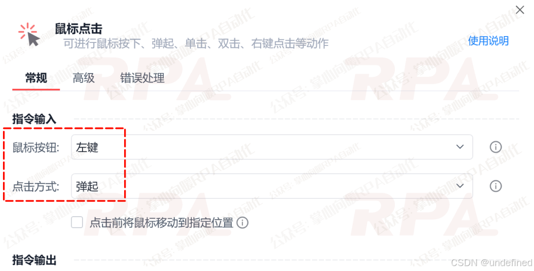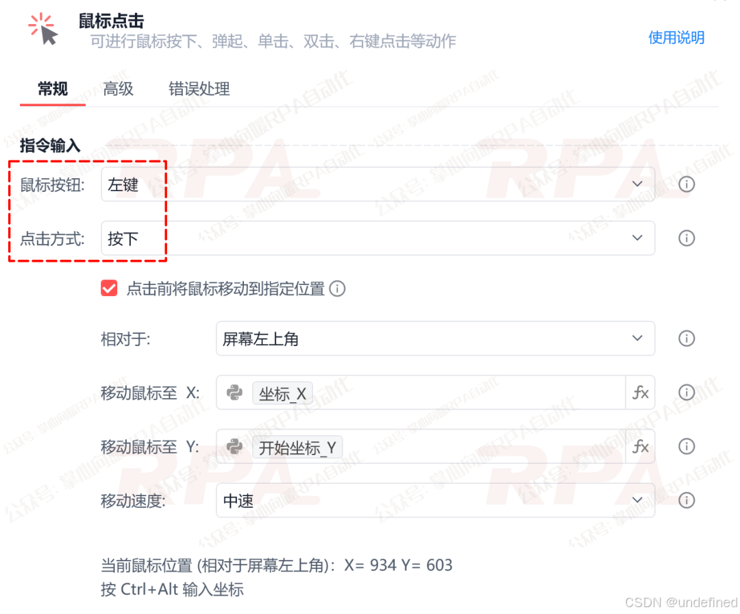 **使用"鼠标点击"指令,**先将鼠标指针精确移动到滑块的起始位置,"点击方式"选择"按下",此时,鼠标状态变为"拖拽模式"。