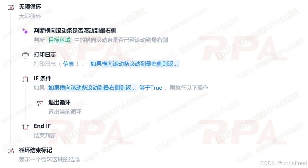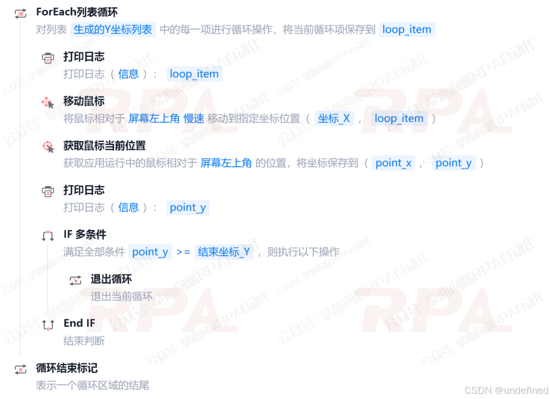 - IF 判断:如果"当前Y坐标 >= End_y",说明已经拖到底了,执行"退出循环"。否则,继续下一次循环,往下拉一段距离。