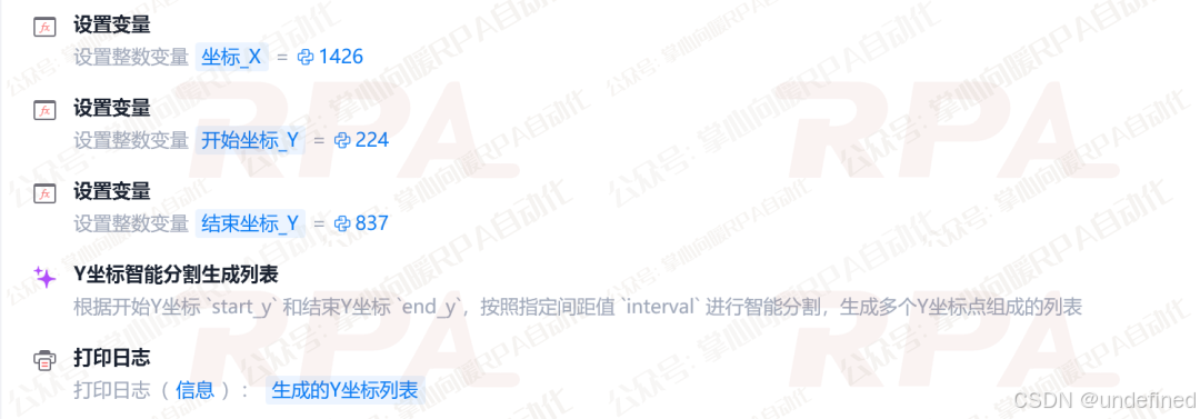 - 利用"魔法指令",根据开始Y坐标 `Start_y` 和结束Y坐标 `End_y`,按照指定间距值(*下面案例中该值为"70像素")进行智能分割,生成多个Y坐标点组成的列表/后续鼠标移动的所有落脚点,例如 [224, 294, 364, 434, 504, 574, 644, 714, 784, 837]。