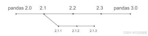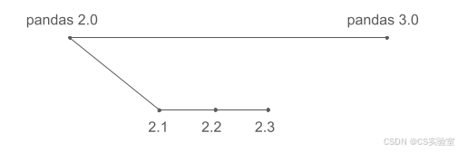 pandas 不会在跨主版本的不同分支上并行开发功能。相反,新功能会持续合并到主开发分支中,并在准备就绪后包含在下一个版本中(例如 2.1)。因此,pandas 3.0 并不包含自 pandas 2.0(大约三年前发布)以来开发的所有内容,而主要包含自 pandas 2.3(大约六个月前发布)以来新增的内容。
