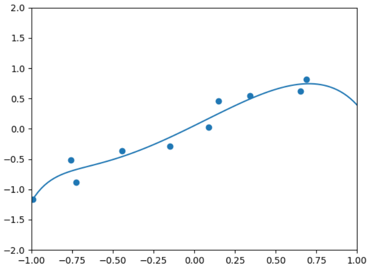 首先生成了一组样本数据,并使用10次多项式来拟合这些数据。