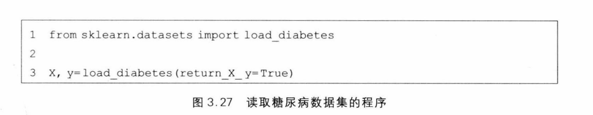 糖尿病数据集是Sklearn提供的一个标准数据集。它从442例糖尿病患者的资料中选取了10个特征----年龄、性别、体重、血压和6个血清测量值,以及这些患者在一年后疾病发展的病情量化值。糖尿病预测问题的任务是根据上述10个特征预测病情量化值。图3.27是读取糖尿病数据集的程序,其中load_diabetes函数返回特征矩阵X与标签向量y。