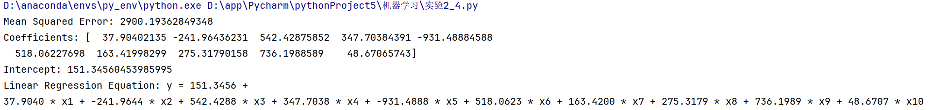 首先加载了糖尿病数据集,并将数据集分为训练集和测试集。接着,创建了一个线性回归模型并用训练集数据进行训练。训练完成后,模型对测试集进行了预测。然后,计算了预测结果的均方误差(MSE)以评估模型性能。此外,还提取了模型的系数和截距,并将它们打印出来。最后,根据这些系数和截距,构建并打印出了线性回归方程,该方程描述了各个特征与目标变量之间的关系。