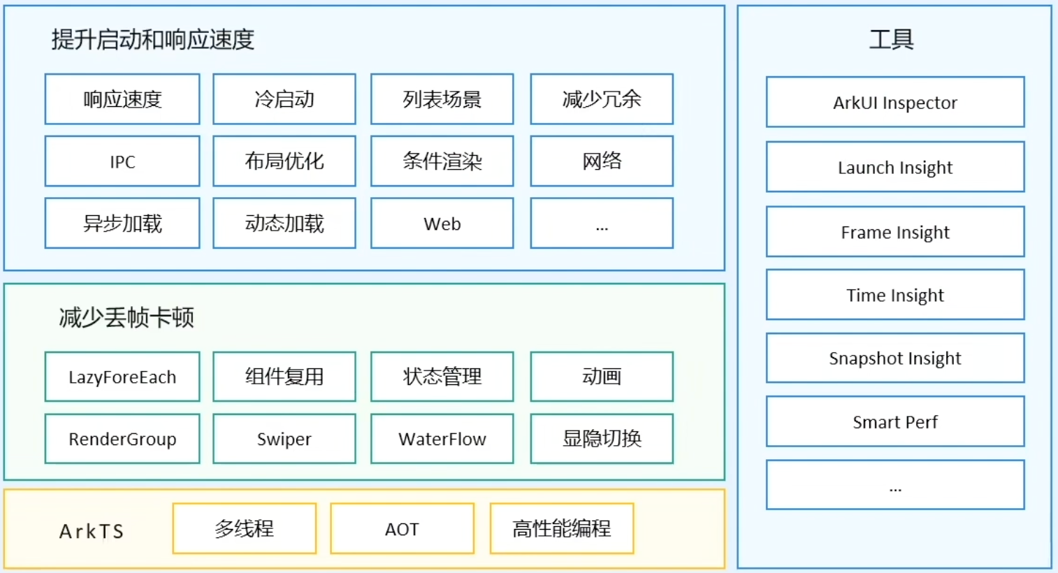 高性能编程分三个方面内容:如何使用多线程、如何使用AOT、怎么利用ArkTS语言的特性实现高性能编程。