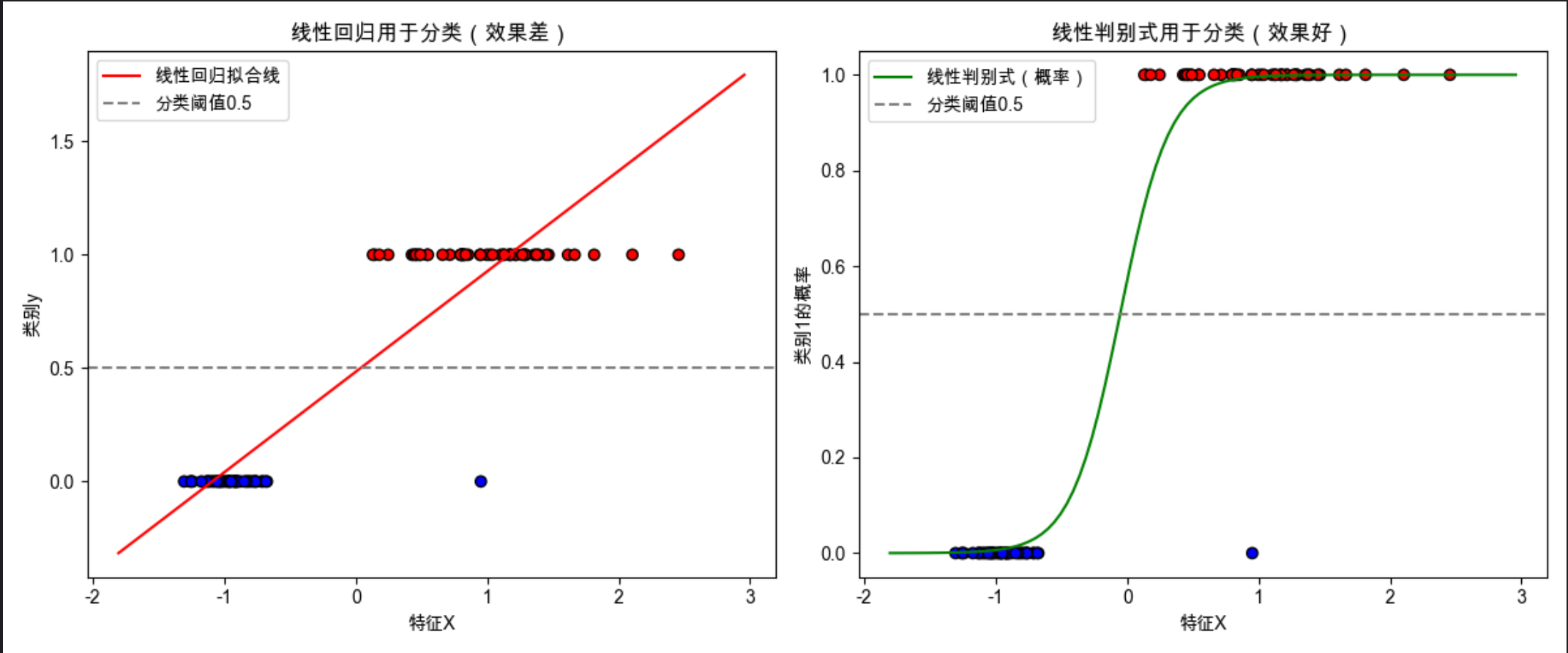 make_classification:生成模拟的二分类数据(1 个特征,2 个类别);- 线性回归拟合的是 "连续值",当用 0.5 作为分类阈值时,会出现明显的分类错误;