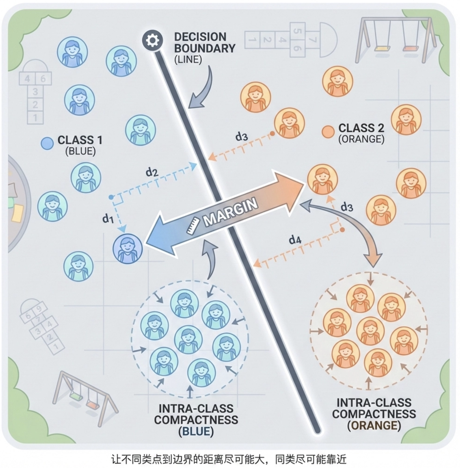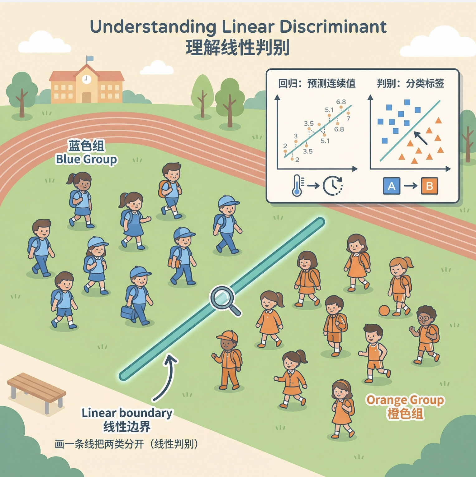 你可以把它想象成:在操场上有两群不同班级的学生,你需要画一条线,让一班的学生都在线左边,二班的都在线右边 ------ 这条线就是线性判别式。