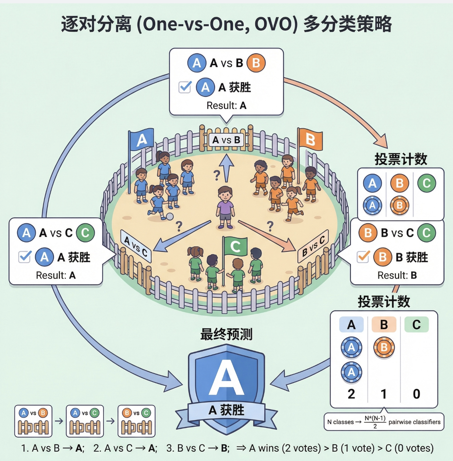 - 一对多(One-vs-Rest):为每个类别训练一个判别式,判断 "是 / 不是该类别";