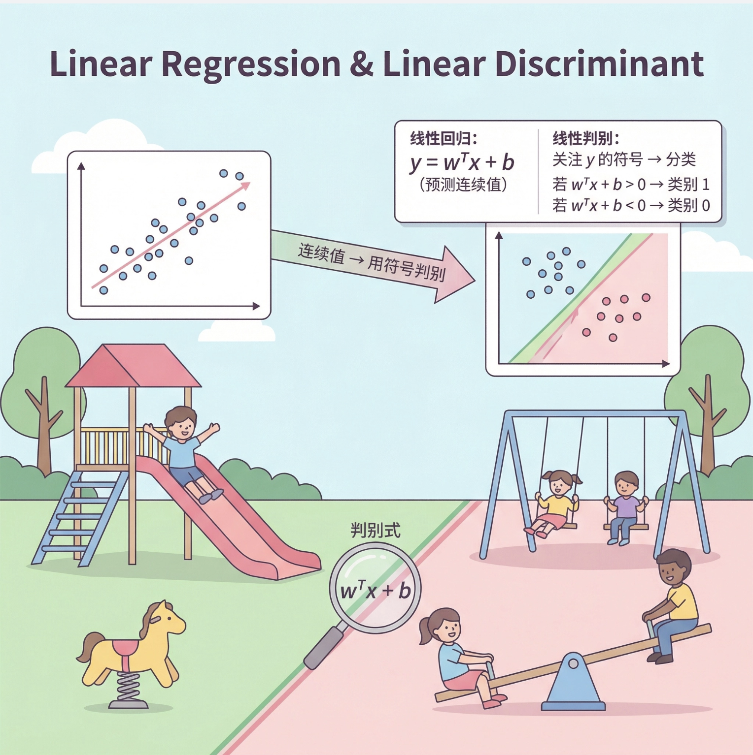 线性回归的公式是 y=wTx+b(预测连续值),而线性判别式是对这个模型的 "分类化改造":