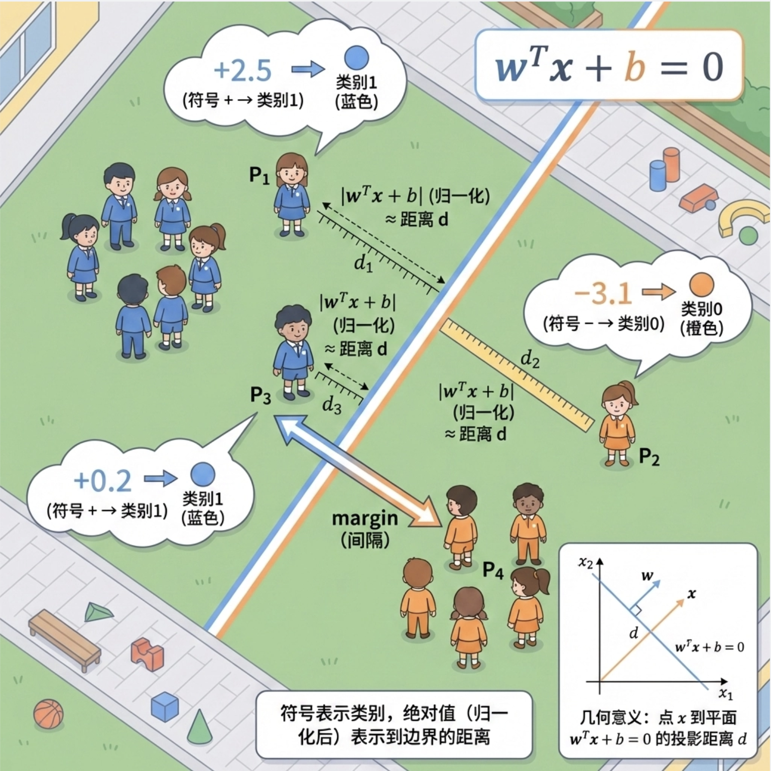 - 比如:当 wTx+b>0 时,判定为类别 1;当 wTx+b<0 时,判定为类别 0。