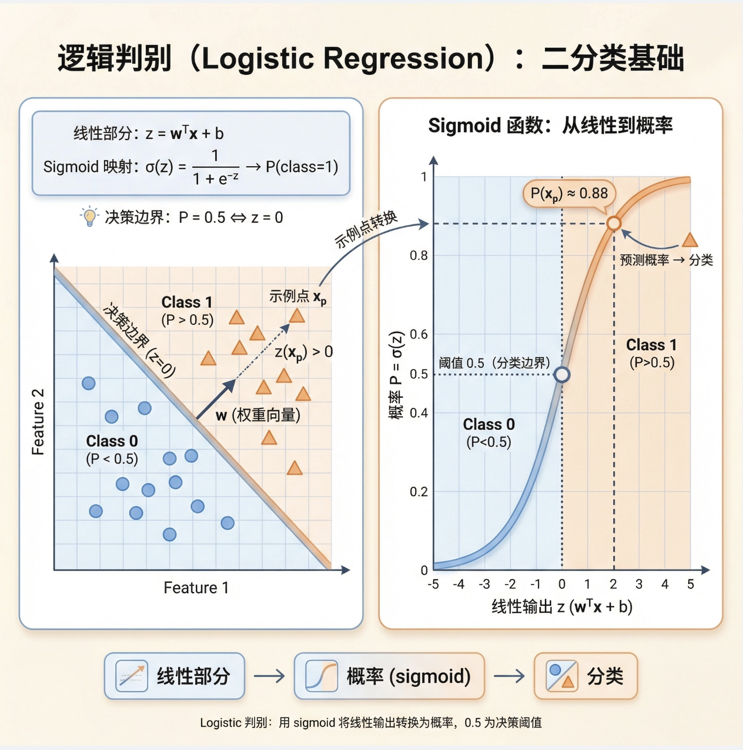 2.关键实现:两类问题用 Sigmoid + 交叉熵,多类问题用 Softmax 或 One-vs-One/One-vs-Rest,训练用梯度下降;