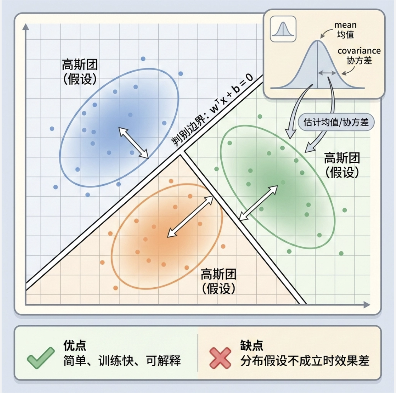- 线性判别式的 "线性" 指决策边界是线性的,而非模型输入输出的关系;