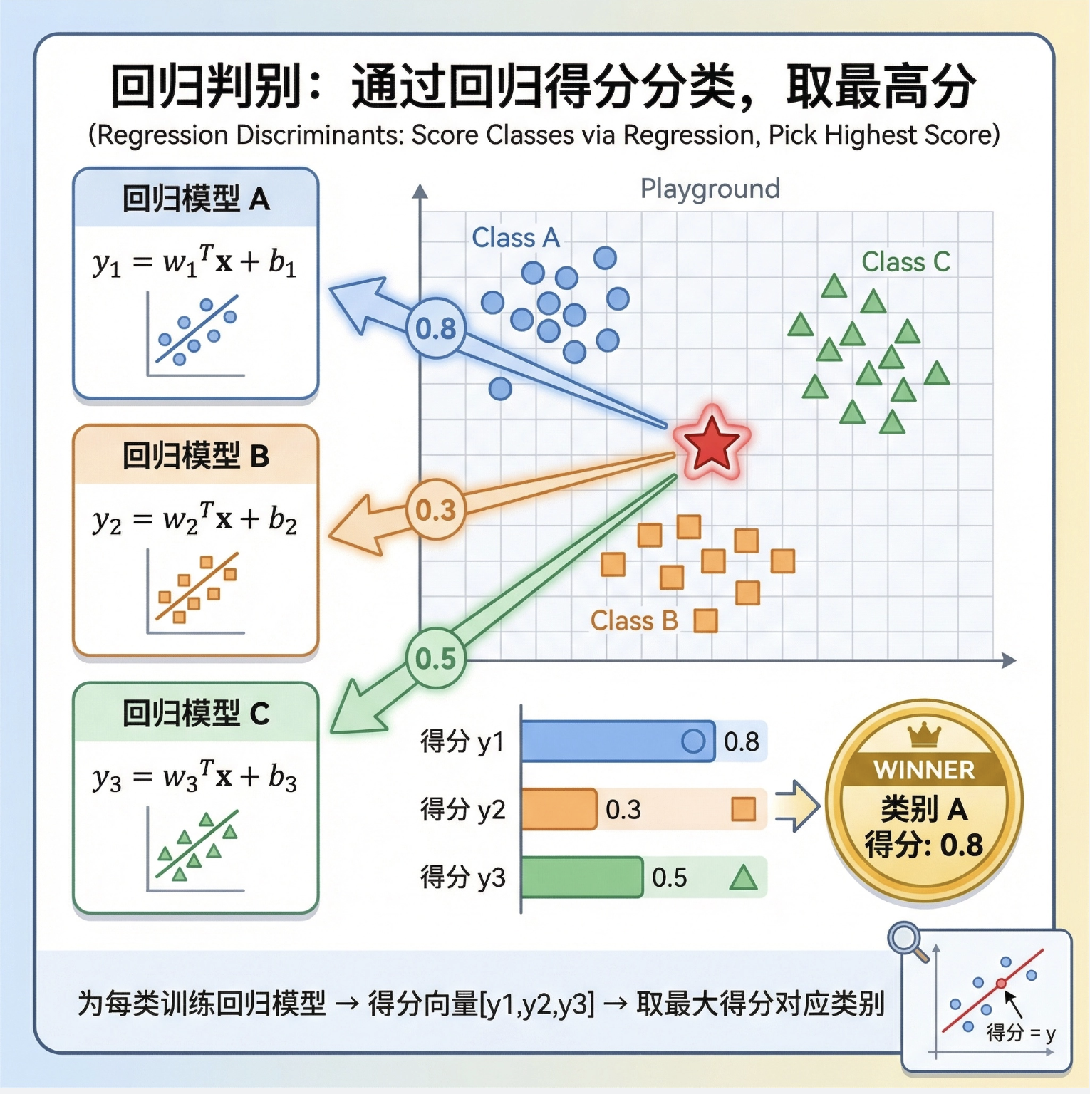 比如 3 类问题:训练 3 个回归模型(y1=w1Tx+b1、y2=w2Tx+b2、y3=w3Tx+b3),新样本的得分是[y1,y2,y3],选最大的那个作为类别。