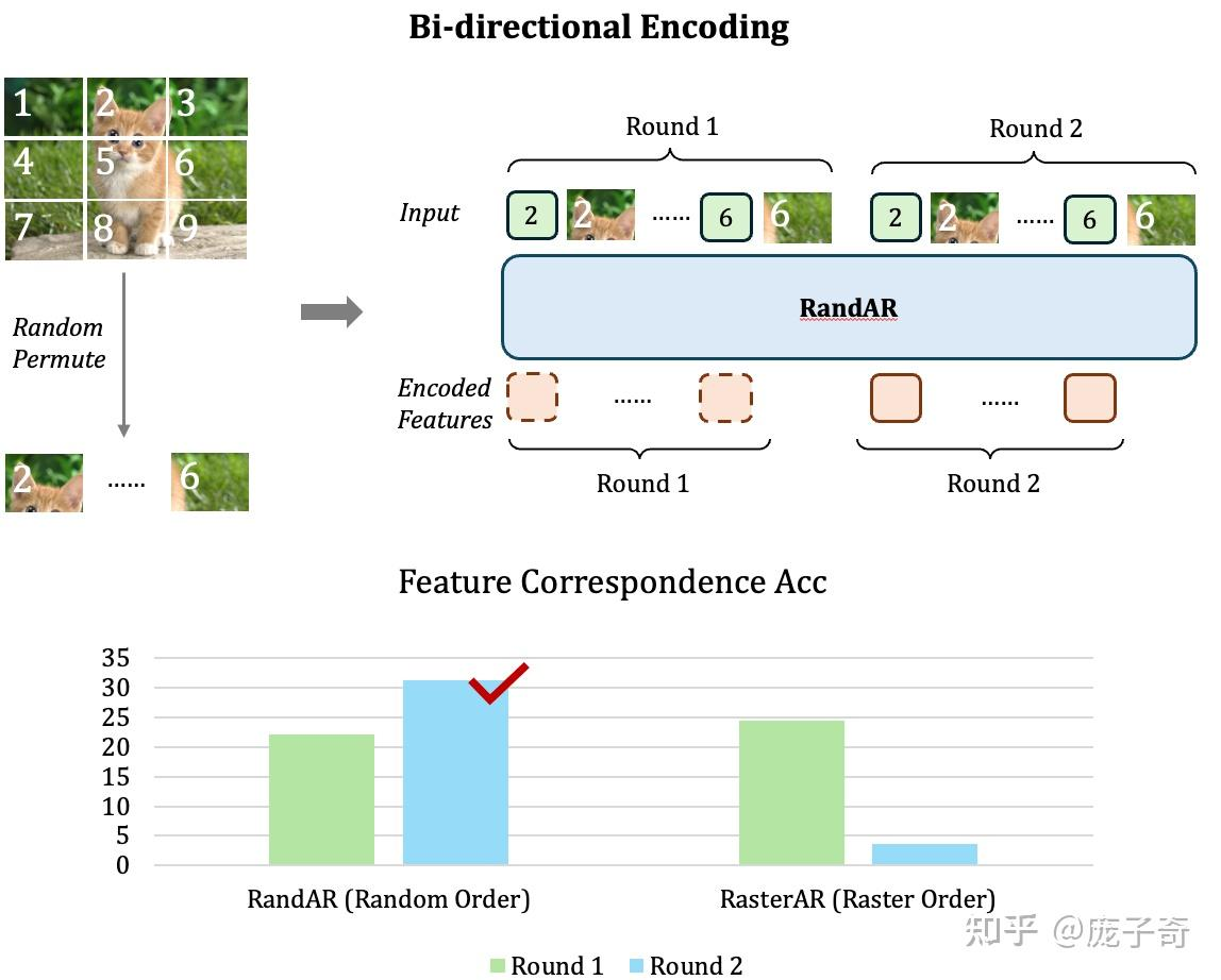 一个直接的解决办法就是------把图像Token序列再输入一遍,然后只取第二轮序列的Representation,这样每个图片Token都可以得到完整的图片信息了。从对比中可以看到,使用了Random-order的模型可以直接泛化到这种提取Representation的方式,但是按照Raster-order训练的模型却会直接崩掉。