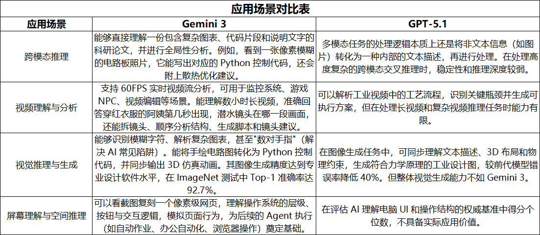 表格对比维度Gemini 3GPT-5.1设计理念原生多模态架构,从训练之初就将文本、图像、视频、音频等所有信息统一转化为向量 Token 处理,彻底抛弃外挂式编码器采用"模态拼接"的折中方案,将图像编码器外挂到语言模型上,通过工程集成实现多模态功能核心优势实现了多模态数据的无缝协同,如同"手机原生搭载全能摄像头",避免了传统模型"各模态独立处理后拼凑"导致的逻辑断裂文本处理能力依然强大,但跨模态推理时容易出现信息断层和逻辑不一致技术实现采用"分层注意力机制+稀疏混合专家(Sparse MoE)"设计,视觉、音频、文本等数据先进入各自专属"专业工作室"进行特征提取,推理阶段通过全局注意力机制实现多模态信息的集中"协同决策"基于文本模型的基础上扩展多模态能力,在处理复杂跨模态任务时效率较低